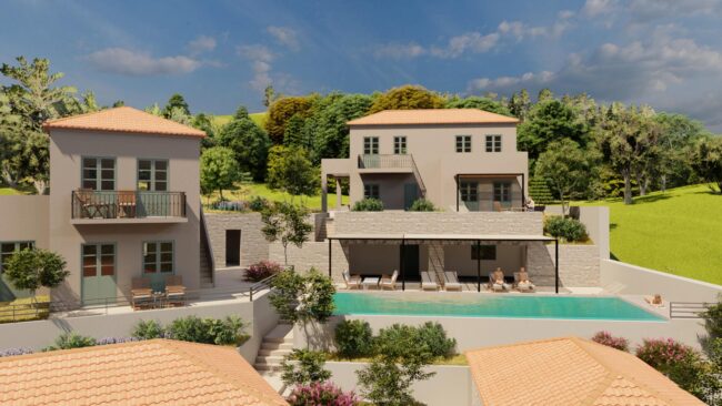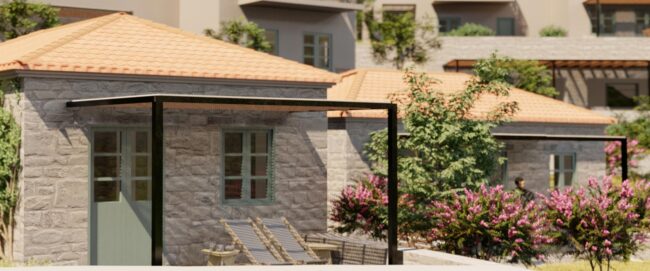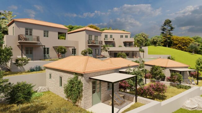 Το έργο περιλαμβάνει πέντε ανεξάρτητα κτίρια με συνολική δόμηση 400 m², σχεδιασμένα με σεβασμό στην τοπική αρχιτεκτονική. Η μελέτη συνδυάζει παραδοσιακά υλικά όπως πέτρα και ξύλο ενώ οι χώροι διαμορφώνονται με σύγχρονες ανέσεις, προσφέροντας στους επισκέπτες την ευκαιρία να ζήσουν μία αυθεντική εμπειρία διαμονής σε επαφή με τη φύση.