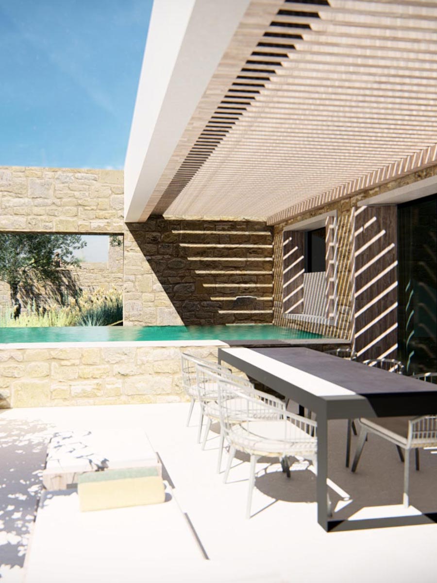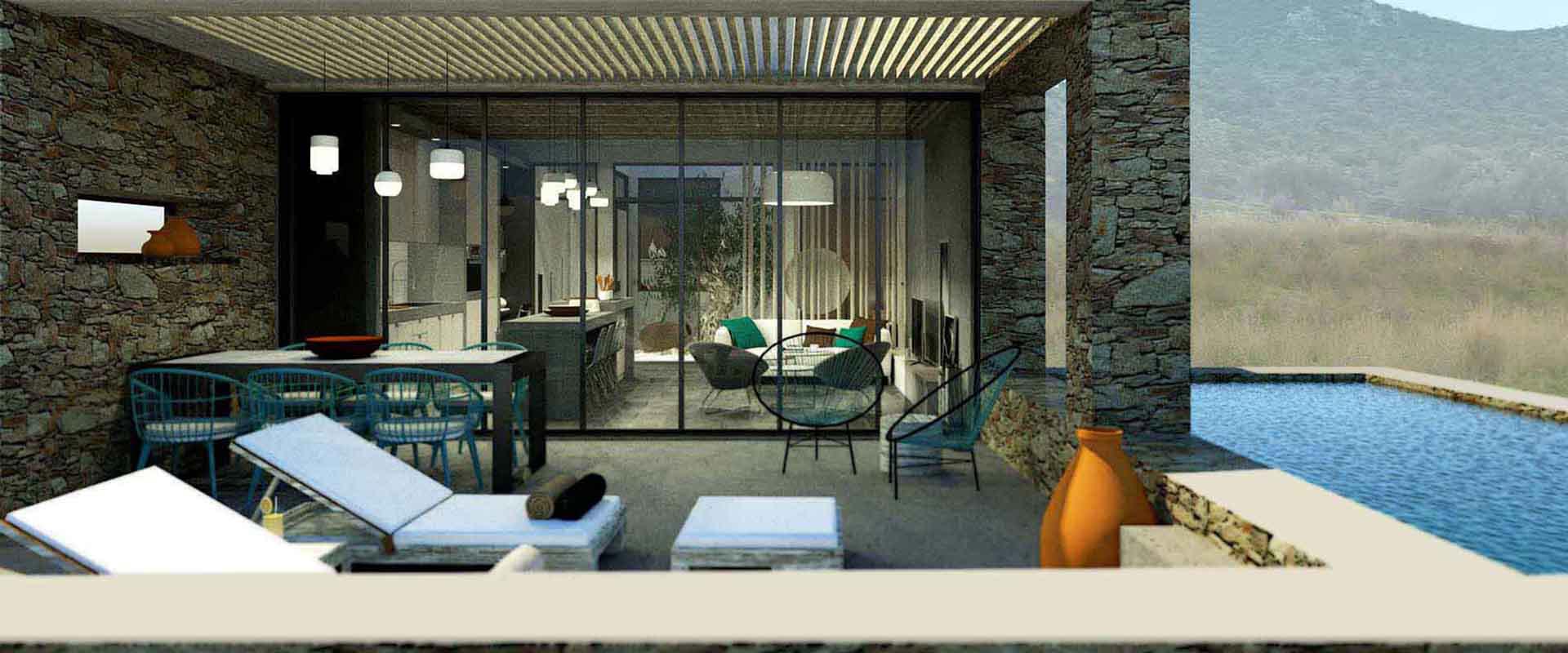 Το αποτέλεσμα συνοψίζεται σε ένα σχεδιασμό που δεν επιβάλλεται στο τοπίο, αλλά το αναδεικνύει, προσφέροντας μια εμπειρία διαβίωσης απολαμβάνοντας τα οφέλη που απλλόχερα προσφέρει ο τόπος.