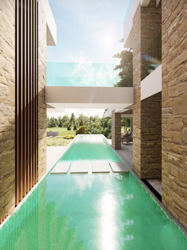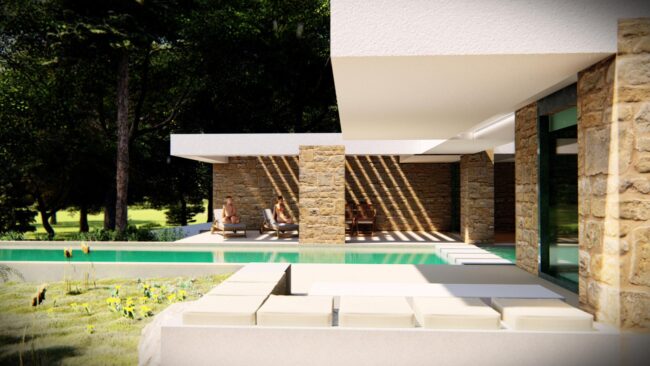 Με βάση τα ζητούμενα, διαμορφώνεται ένα κεντρικό αίθριο που προσφέρει φυσικό φωτισμό και αερισμό, ενώ στη συνέχειά του τοποθετείται ο χώρος της πισίνας. Με τον τρόπο αυτό, εισάγεται το φυσικό στοιχείο στην κάτοψη και όλοι οι χώροι διημέρευσης σχεδιάζονται γύρω του.