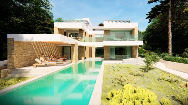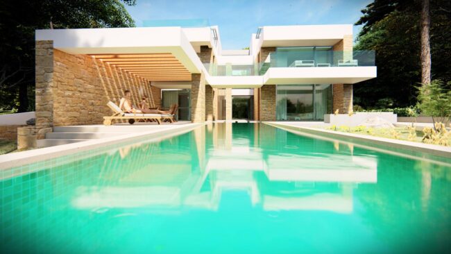 Οι ιδιοκτήτες οραματίστηκαν μια πολυτελή κατοικία με άνετους εσωτερικούς χώρους και με ποιοτικούς υπαίθριους χώρους σε συνέχεια αυτών. Κύριο στοιχείο της σύνθεσης ζητήθηκε να αποτελέσει η πισίνα.
