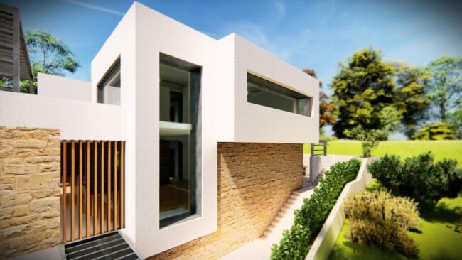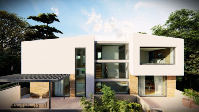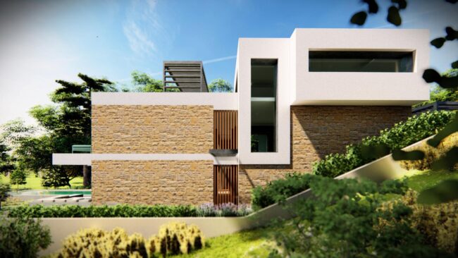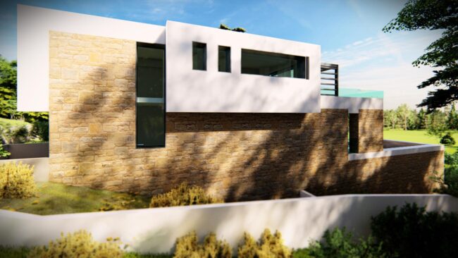 Οι καθαρές γεωμετρικές φόρμες και η διάταξη των όγκων αποπνέουν λιτότητα και δυναμισμό. Αισθητικά, η κατοικία αποτελείται από μια βάση από τοιχία εμφανούς λιθοδομής, τα οποία στέφονται από λευκούς γεωμετρικούς όγκους.