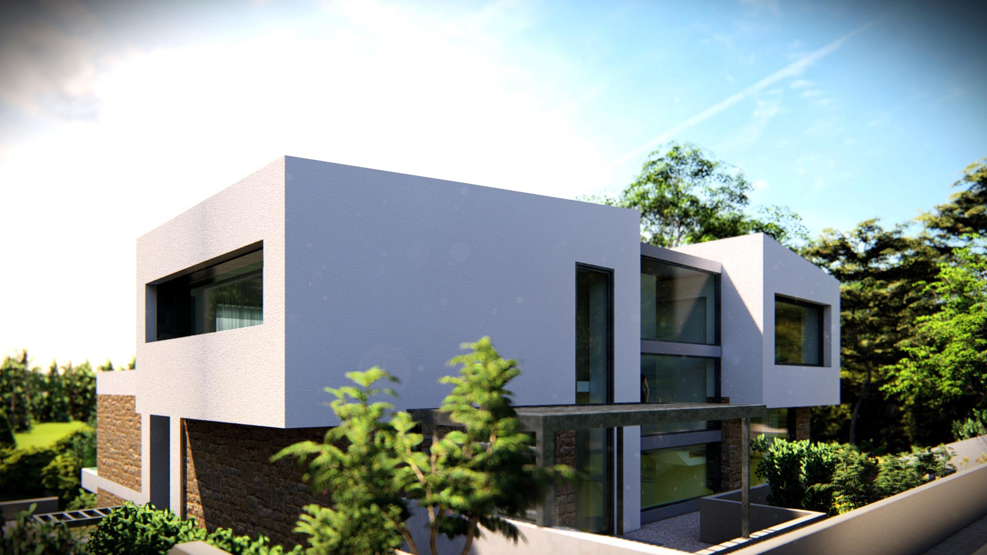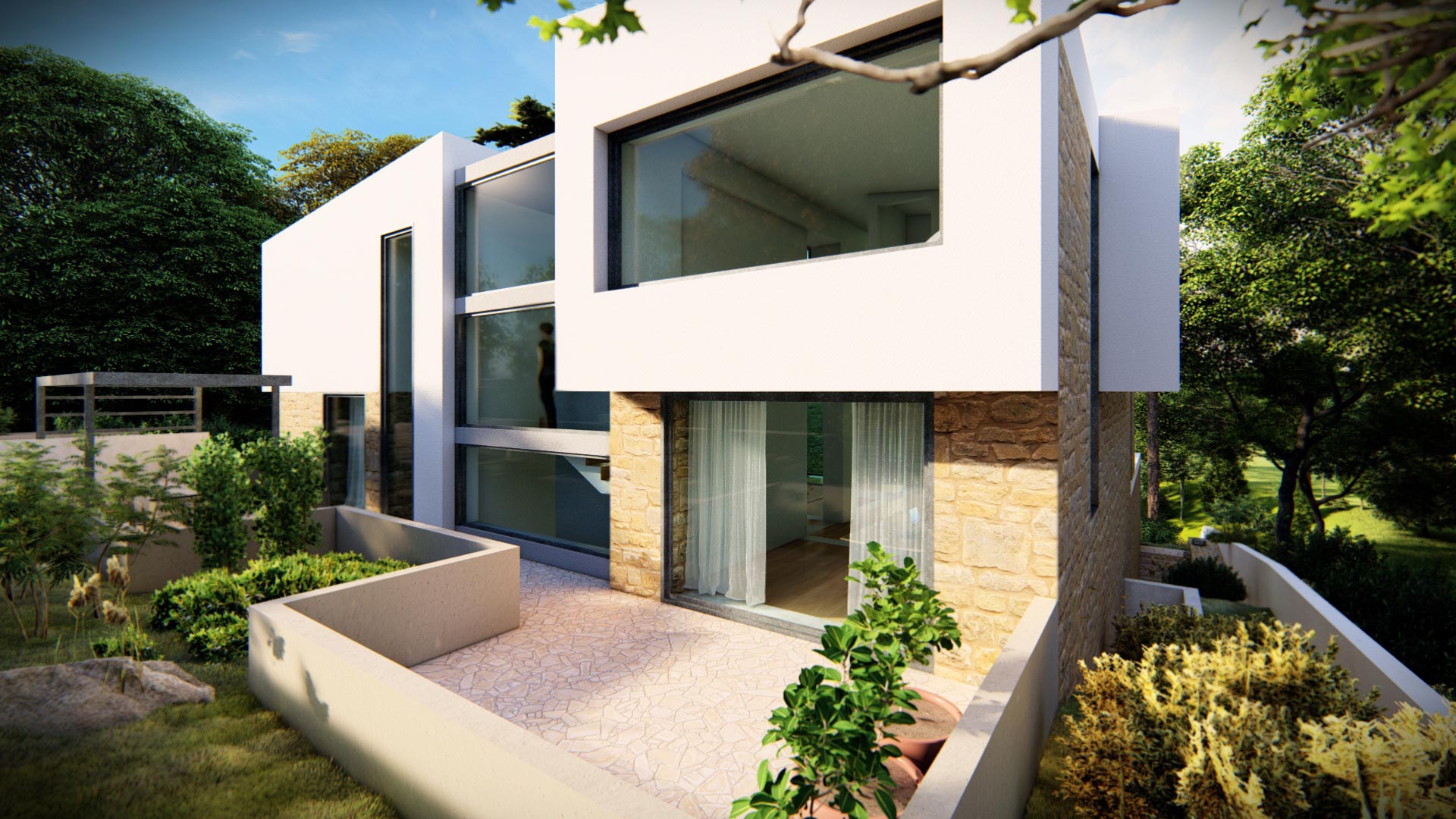Οι καθαρές γεωμετρικές φόρμες και η διάταξη των όγκων αποπνέουν λιτότητα και δυναμισμό. Αισθητικά, η κατοικία αποτελείται από μια βάση από τοιχία εμφανούς λιθοδομής, τα οποία στέφονται από λευκούς γεωμετρικούς όγκους.