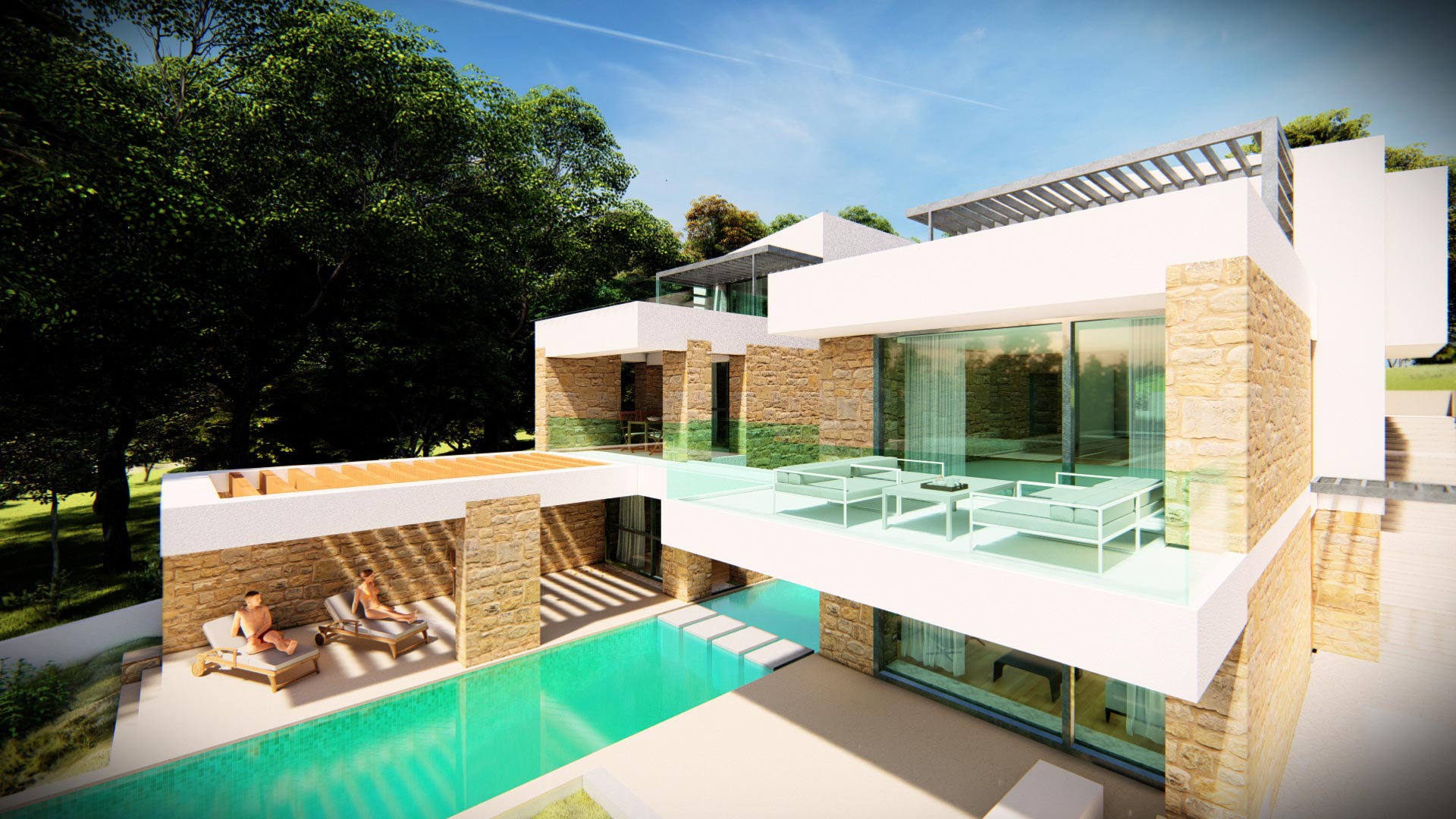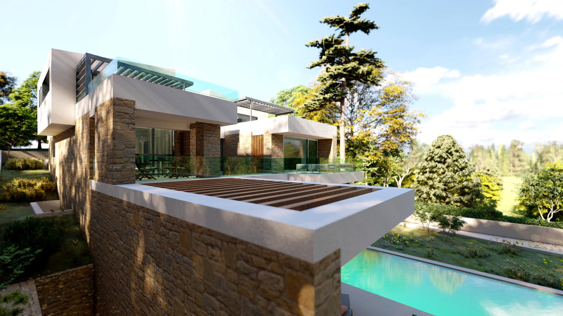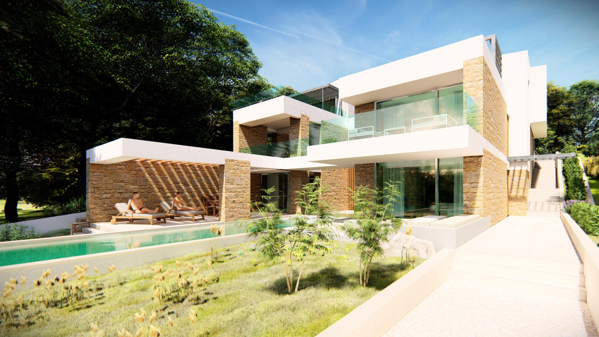 Οι ιδιοκτήτες οραματίστηκαν μια πολυτελή κατοικία με άνετους εσωτερικούς χώρους και με ποιοτικούς υπαίθριους χώρους σε συνέχεια αυτών. Κύριο στοιχείο της σύνθεσης ζητήθηκε να αποτελέσει η πισίνα.
