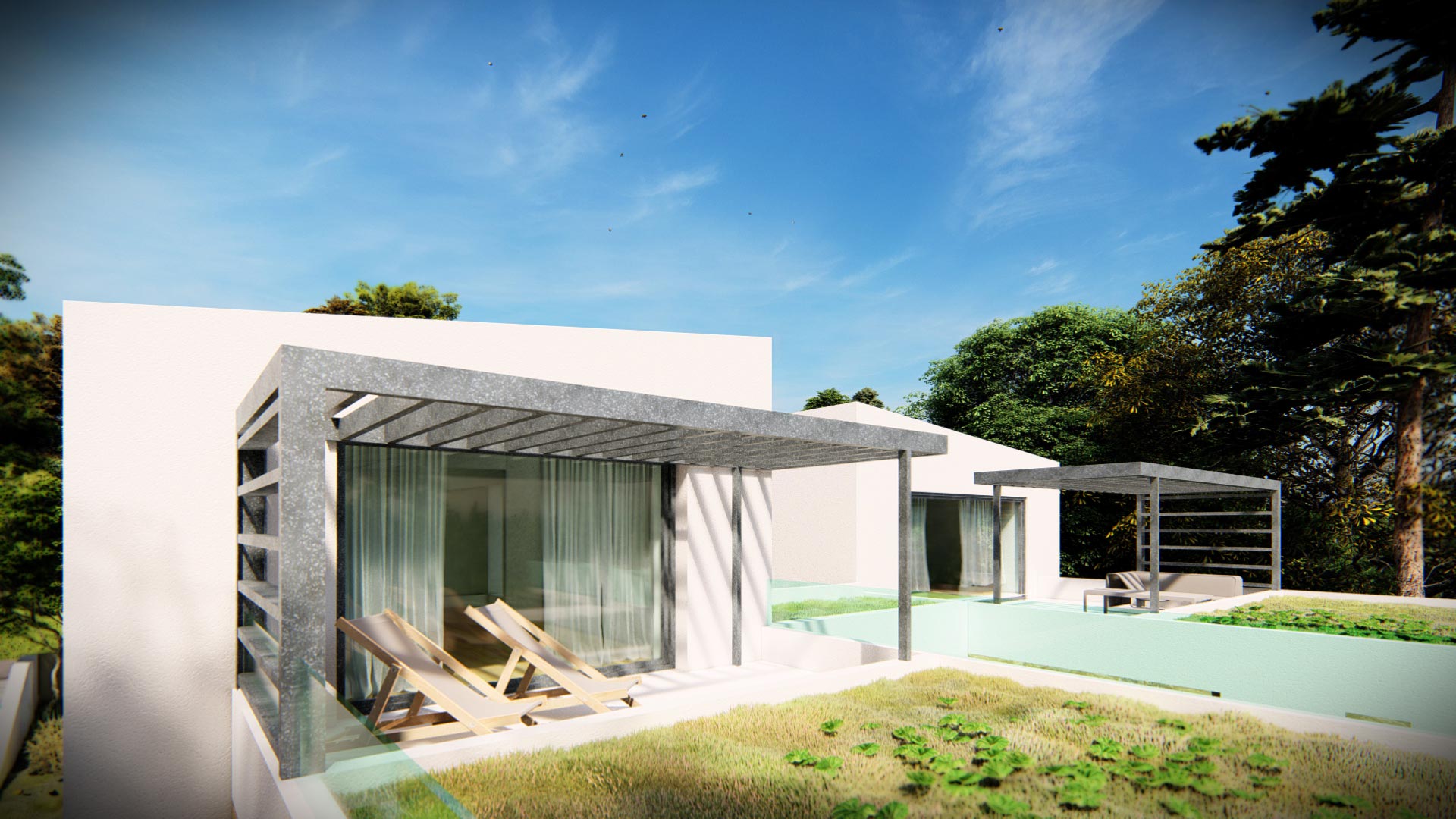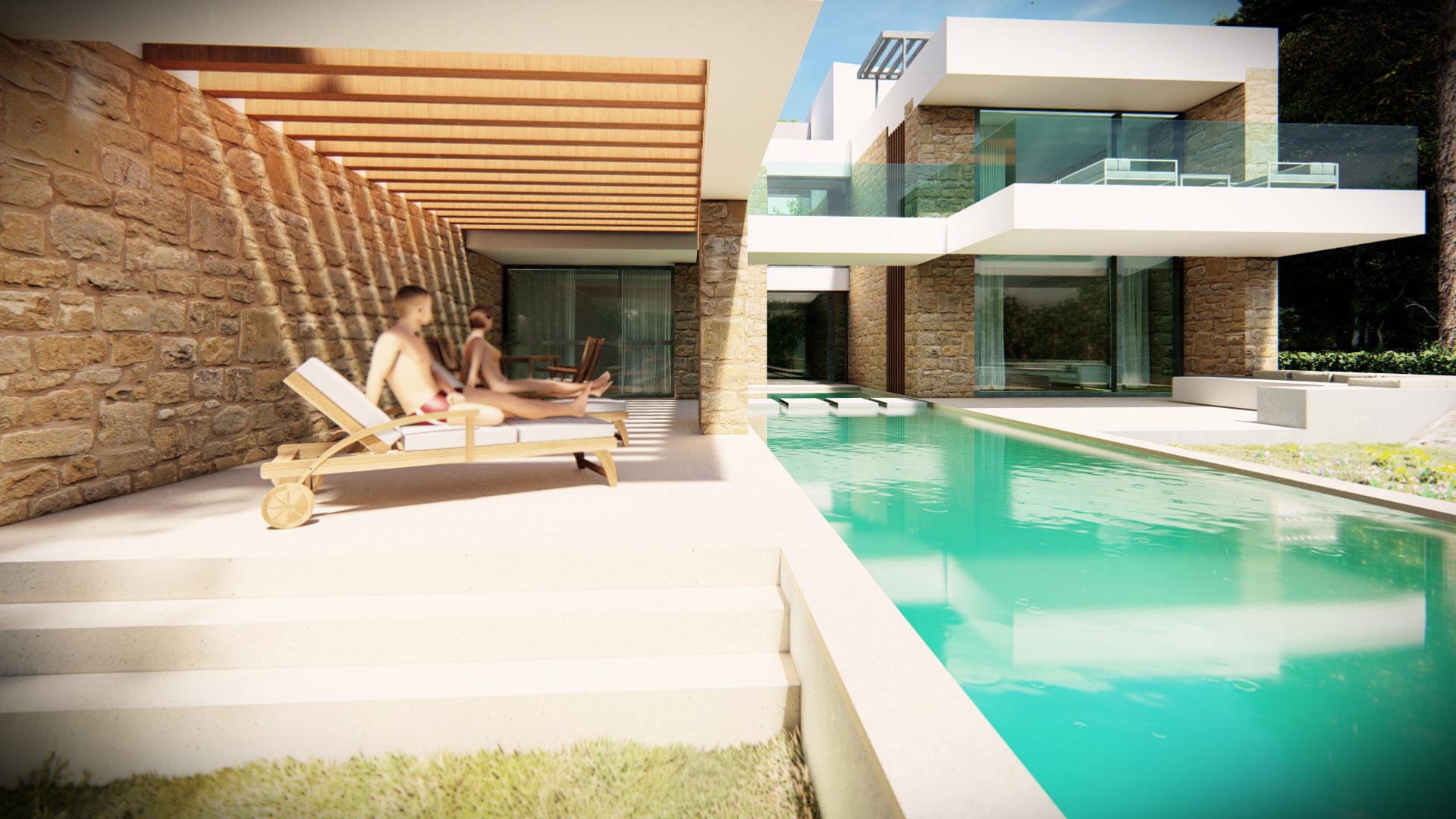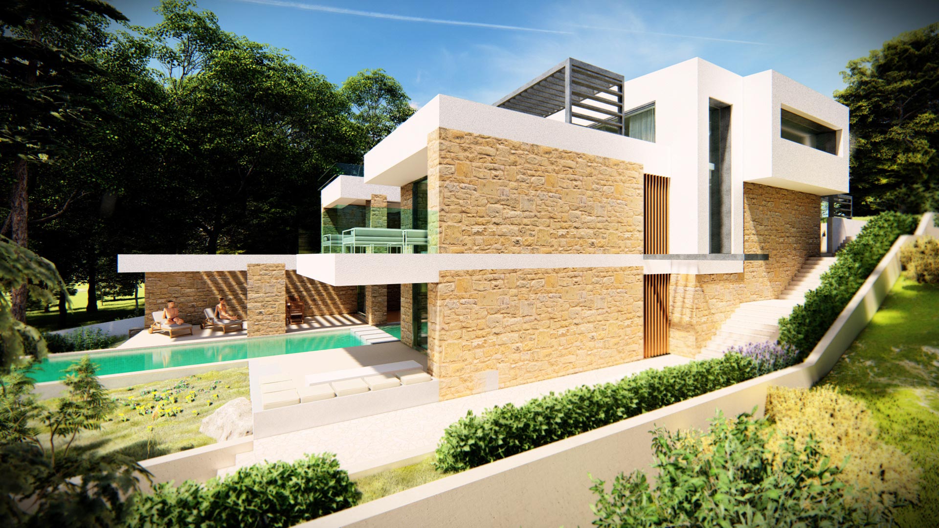 Οι ιδιοκτήτες οραματίστηκαν μια πολυτελή κατοικία με άνετους εσωτερικούς χώρους και με ποιοτικούς υπαίθριους χώρους σε συνέχεια αυτών. Κύριο στοιχείο της σύνθεσης ζητήθηκε να αποτελέσει η πισίνα.