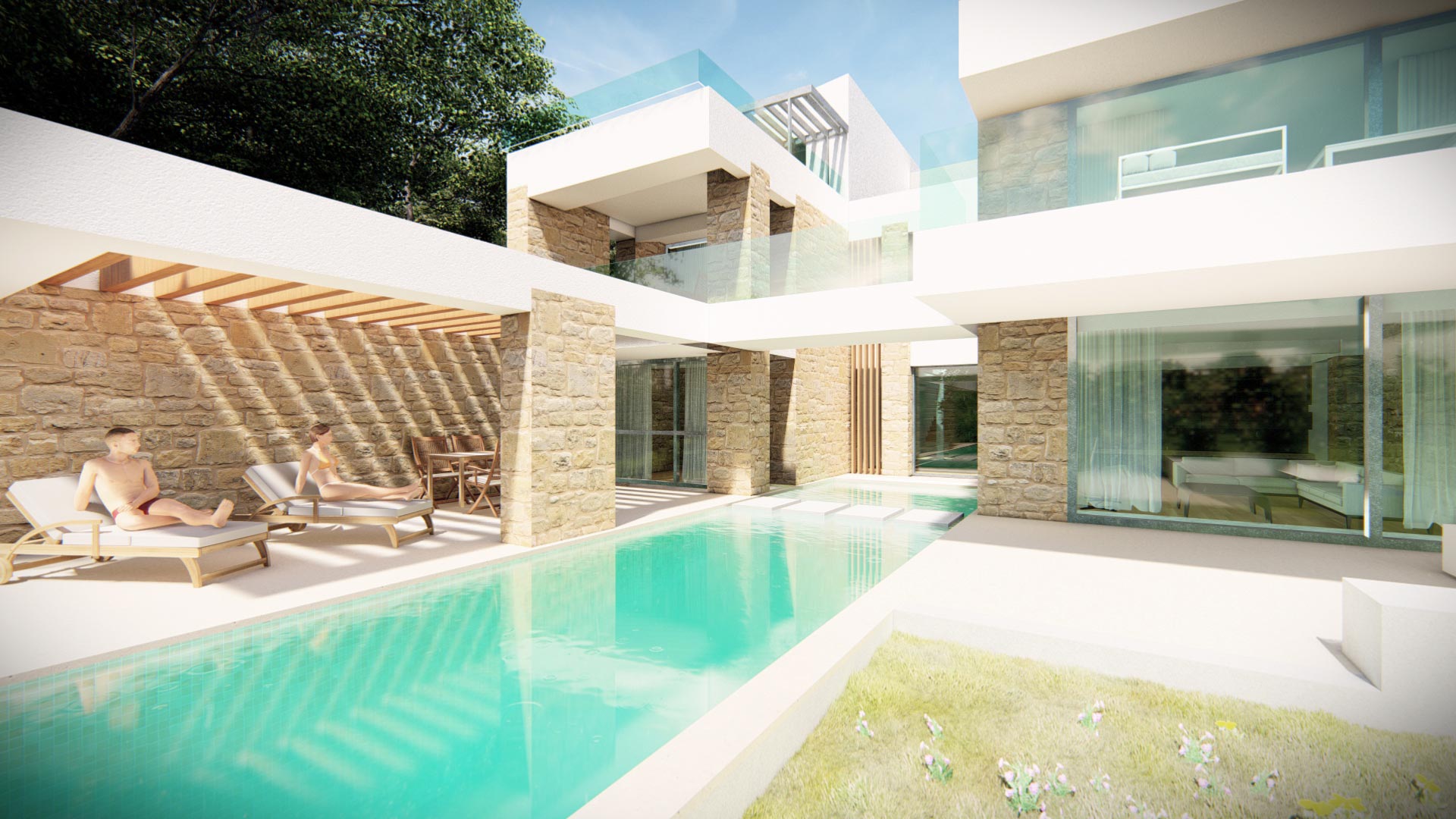 Με βάση τα ζητούμενα, διαμορφώνεται ένα κεντρικό αίθριο που προσφέρει φυσικό φωτισμό και αερισμό, ενώ στη συνέχειά του τοποθετείται ο χώρος της πισίνας. Με τον τρόπο αυτό, εισάγεται το φυσικό στοιχείο στην κάτοψη και όλοι οι χώροι διημέρευσης σχεδιάζονται γύρω του.